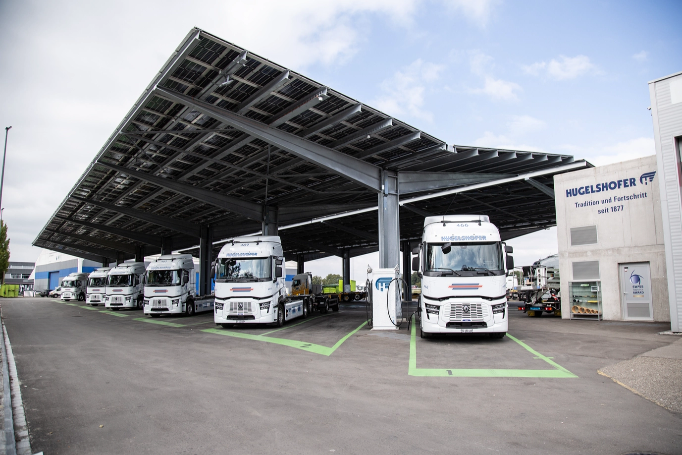 Performansı artıran şarj altyapısı Hugelshofer’in Renault Trucks E-Tech T araçlarının performansı, büyük ölçüde optimize edilmiş bir şarj altyapısına dayanıyor. Taşımacının Frauenfeld tesisinde, maksimum 480 kW güce sahip 30 hızlı şarj istasyonu bulunuyor ve bu altyapı sayesinde günde 100 kamyona kadar şarj gerçekleştirilebiliyor.