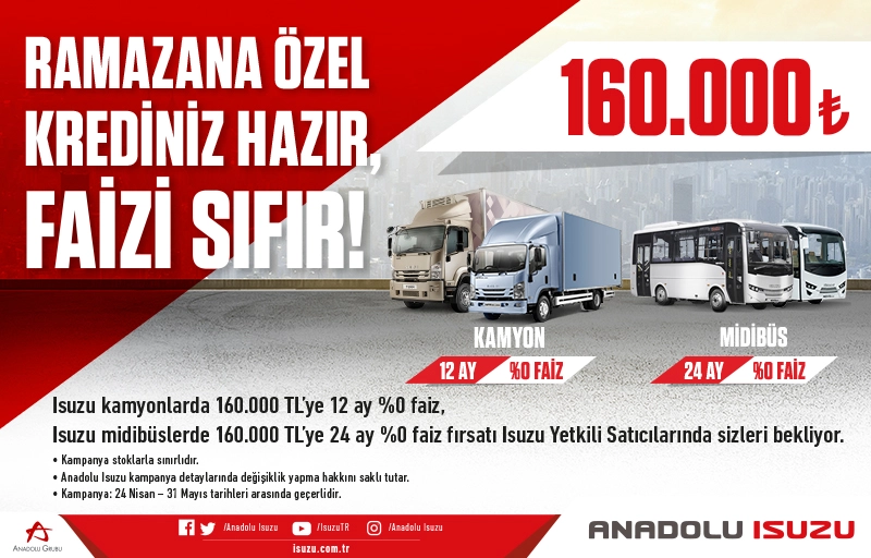 Türkiye’nin en yaygın ticari araç satış ve servis ağına sahip olan Anadolu Isuzu, ticari araç almak isteyen müşterilerine Ramazan ayına özel avantajlı faiz kampanyası sunuyor. Kampanya kapsamında kamyon grubunda 12 ay vadeye %0 faiz oranı ve midibüs grubunda 24 ay vadeye %0 faiz ile araç satın almak mümkün.