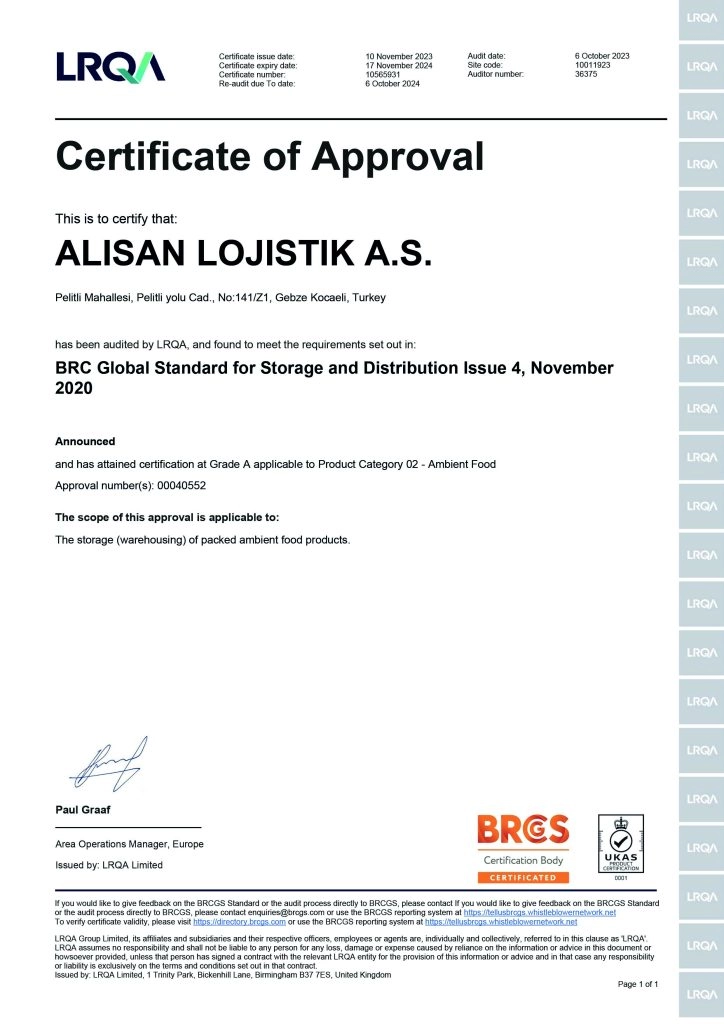 Belgelendirilmesi bağımsız ve uluslararası akredite kuruluşlar tarafından yapılmakta olan ve her aşaması takip edilen BRCGS (British Retail Consortium Global Standards- İngiliz Perakendeciler Birliği Gıda Teknik Standartları), gıda üreten, işleyen ve paketleyen endüstrilerde gıda güvenliği, bütünlüğü, yasallığı ve kalitesinin nasıl yönetilmesi gerektiğini denetleyen güvenlik standartları olarak büyük önem taşıyor. Dünya üzerinde denetlendikten sonra “Gıda Güvenliği Belgesi” ile taçlandırılan sınırlı sayıdaki firmadan biri de kimya taşımacılığındaki uzmanlığının yanı sıra hızlı tüketim ürünleri (FMCG) taşımacılığındaki iddiası ile dikkat çeken Alışan Lojistik oldu.