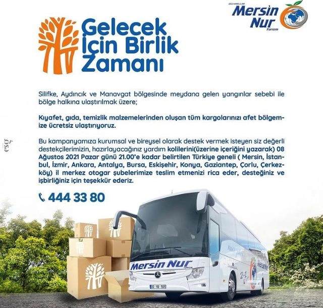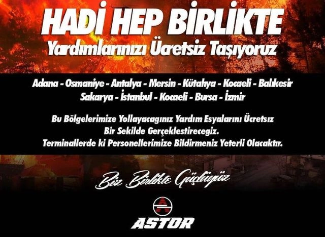 Ülkemiz yanıyor, yüreğimiz yanıyor. Türkiye, resmen yangın yerine döndü. Halkımız, her zaman olduğu gibi yardım mağdurları için seferber olmuş durumda. Yardımlar yağıyor, otobüsçü de bu yardımları felaketzedelere ulaştırma konusunda üzerine düşen sorumlulukları yerine getiriyor. Yangın bölgelerine sefer düzenleyen firmalar, yardım kolilerini ücretsiz taşıyor. Bu firmalardan bazılarının duyurularını sizler ile sunuyoruz.