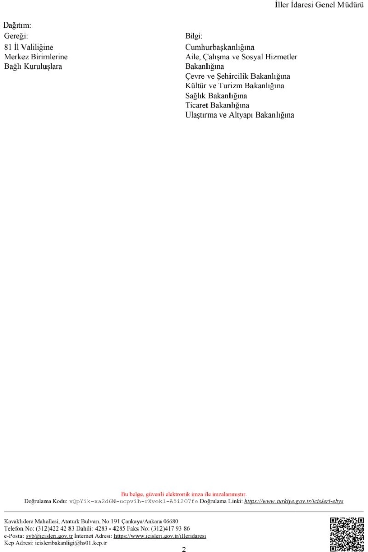 Cumhurbaşkanlığı Kabinesinin 1 Mart 2021 tarihli toplantısında alınan kararlarla kontrollü normalleşme dönemi olarak adlandırılan, illerin belirlenmiş kriterler doğrultusunda düşük, orta, yüksek ve çok yüksek riskli olarak 4 gruba ayrıldığı ve il bazlı tedbirlerin bu risk gruplarına göre belirlendiği yeni bir sürece girilmiştir. Bu doğrultuda salgınla mücadele sürecinde alınan tüm tedbirlerde göz önünde tutulan üretim, imalat ve tedarik zincirlerinin aksamaması ilkesi açısından önem arz eden ulaşım faaliyetlerinde etkinliğin sağlanması ve seyahat edenlerin mağduriyet yaşamaması amacıyla? 1. Yolcu taşımacılığı faaliyeti gerçekleştirmek üzere Ulaştırma ve Altyapı Bakanlığınca düzenlenen B1, B2, D1, D2 ve D4 yetki belgesi eki taşıt belgesinde kayıtlı olan taşıtlarda, başta HES kodu sorgulanması zorunluluğu olmak üzere Sağlık Bakanlığı Covid19 Salgın Yönetimi ve Çalışma Rehberinde belirtilen tedbirlere uymak kaydıyla ruhsatlarında belirtilen yolcu kapasitesi oranında yolcu kabul edilebilmesi, 2. Çok yüksek risk grubunda bulunan illerimiz hariç olmak üzere terminal ve gar binalarında bulunan yemeiçme (lokanta, restoran, kafeterya, pastane vb.) yerlerinin, Sağlık Bakanlığı Covid19 Salgın Yönetimi Çalışma Rehberinde yer alan tedbirlere uymak kaydıyla ilgi (c) ve (d) Genelgelerimizle getirilen açılışkapanış saatlerine bağlı olmaksızın işyeri açma ve çalışma ruhsatlarında belirtilen çalışma saatlerine uygun şekilde faaliyet göstermeleri, Gerektiği değerlendirilmektedir.Bu doğrultuda Umumi Hıfzıssıhha Kanununun 27 nci ve 72 nci maddeleri uyarınca İl/İlçe Umumi Hıfzıssıhha Kurulları kararlarının ivedilikle alınması, uygulamada herhangi bir aksaklığa meydan verilmemesi ve mağduriyete neden olunmaması ve alınan kararlara uymayanlara Umumi Hıfzıssıhha Kanununun ilgili maddeleri gereğince idari işlem tesis edilmesi hususunda? Bilgi ve gereğini önemle arz ve rica ederim